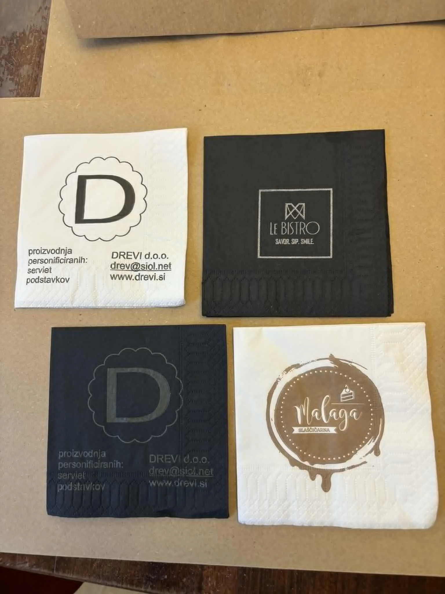 zloženi na 1/4 (20x20cm), do tribarvni tisk. Uporaba gostilne, hoteli.. Nadomeščajo platnene serviete,